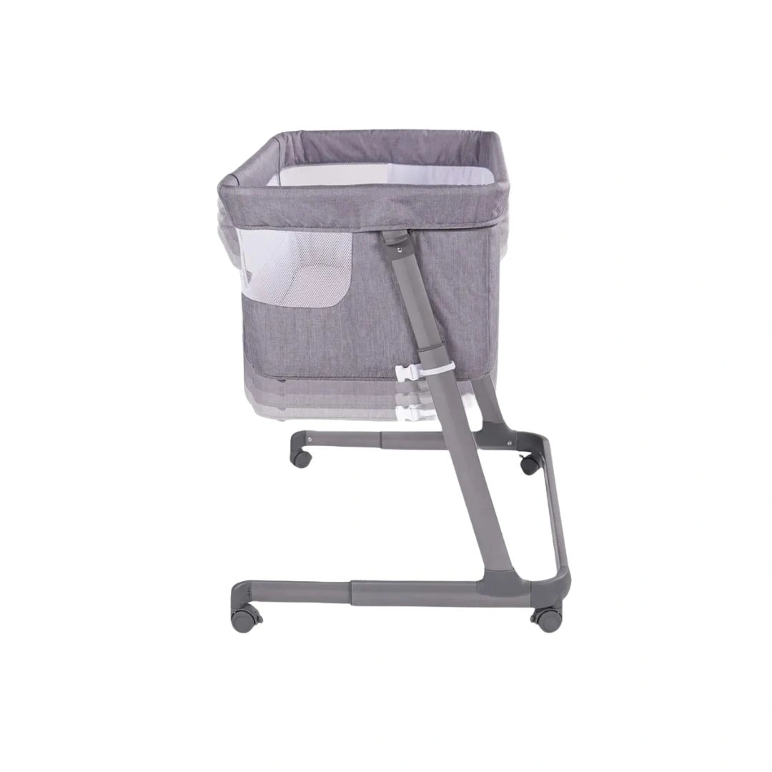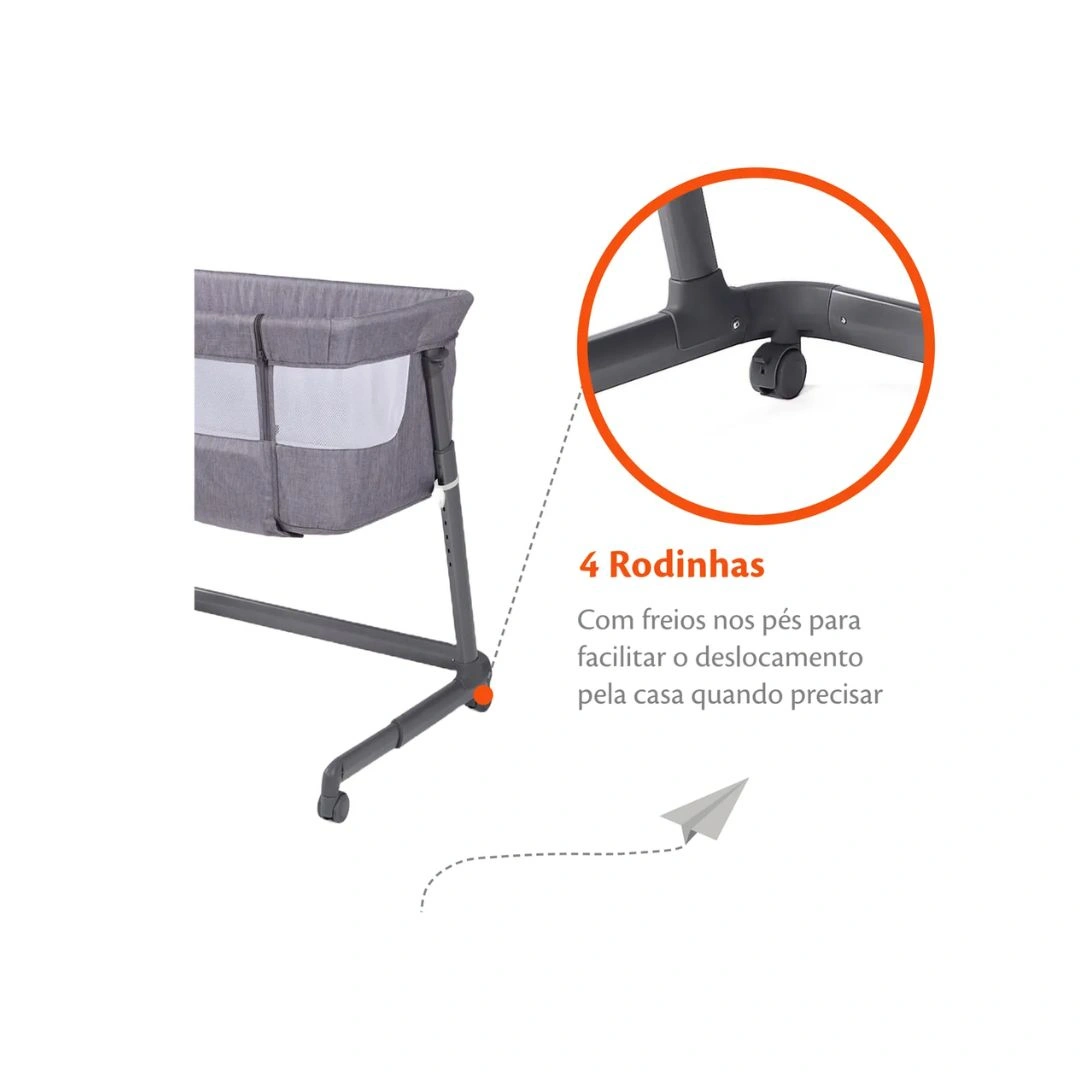 Abertura lateral e tiras para acoplar à cama dos pais com segurança Pode ser usado fechado em qualquer lugar da casa 7 posições de regulagem de altura Colchonete macio 4 rodinhas com freio Pés retráteis Capa removível e lavável