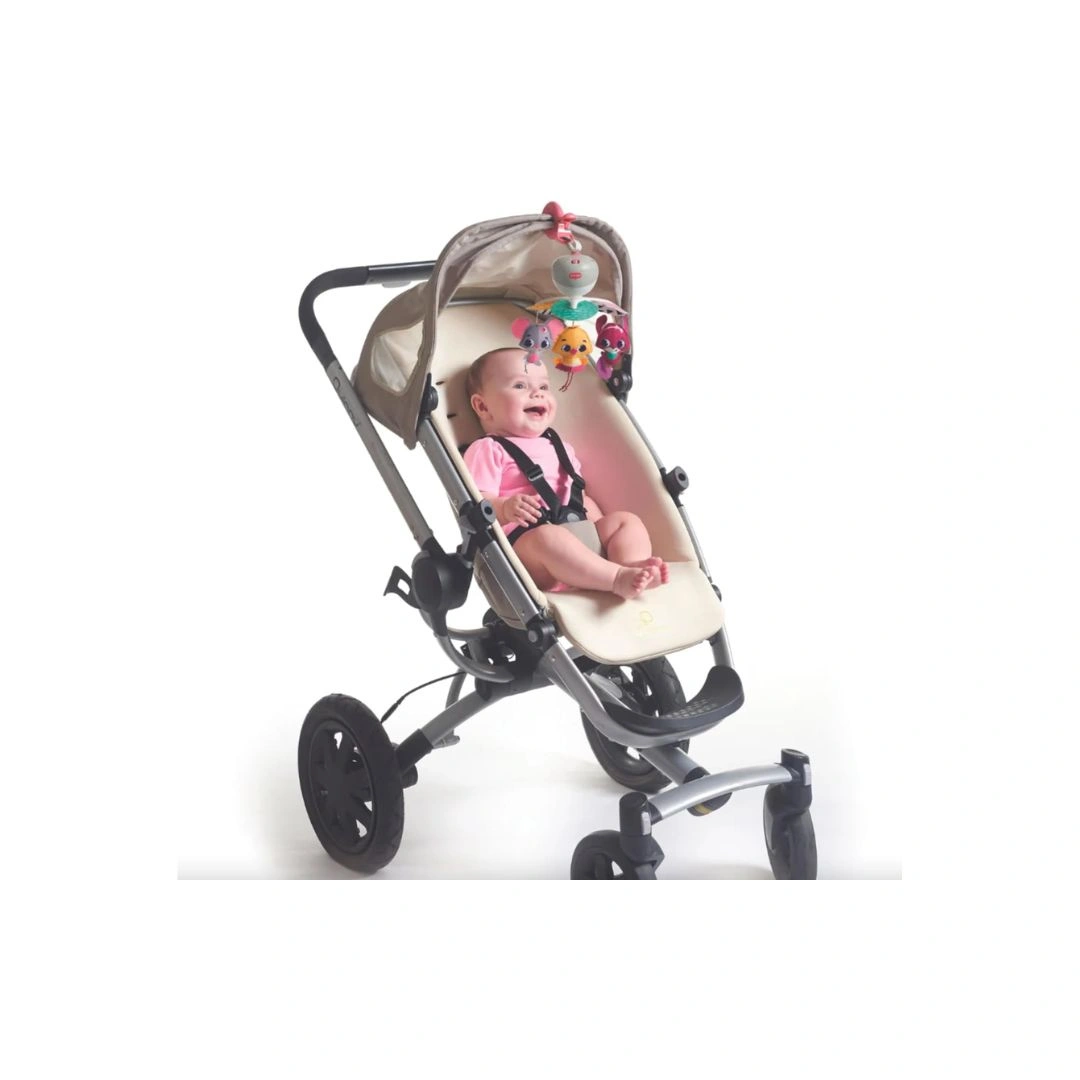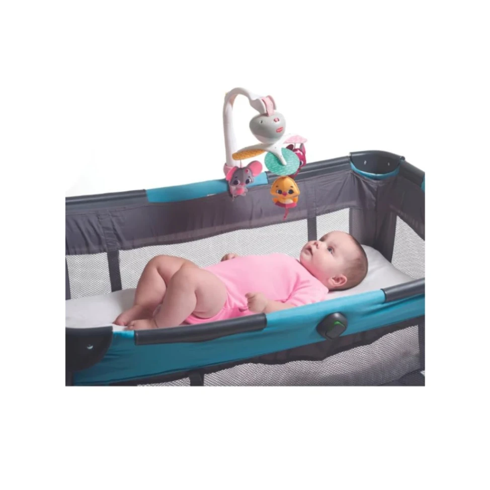 Clipe grande para prender no carrinho Tira de velcro para fixação Encaixe universal acopla na maioria dos berços, cercados, bouncers, carrinhos, moisés e bebê conforto Módulo eletrônico com até 30 minutos de música contínua e 5 melodias diferentes