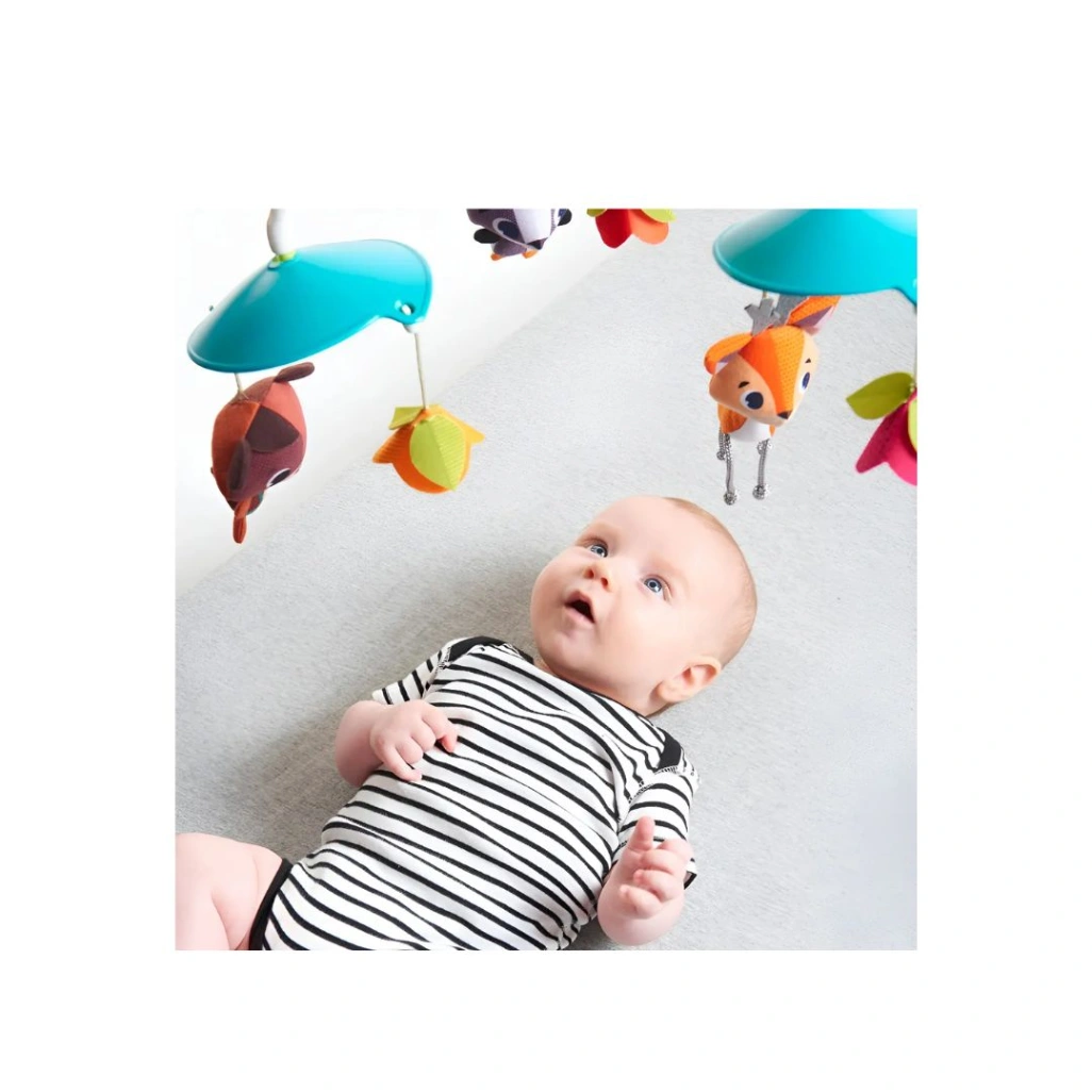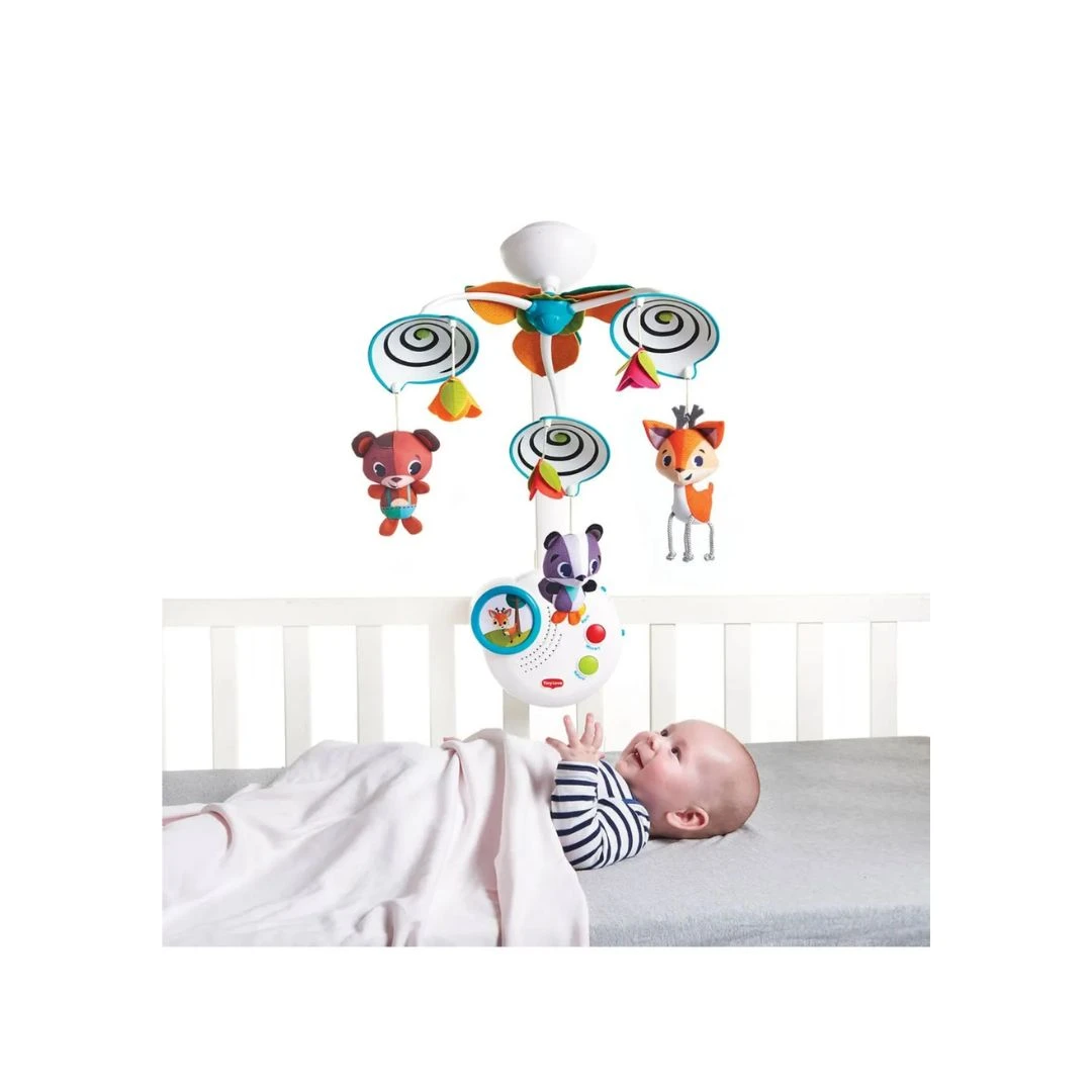 Transforma-se de móbile de berço em uma caixa de música portátil e independente. Oferece 20 minutos contínuos de música clássica para acalmar o bebê. Desenho exclusivo em espiral preto e branco para o desenvolvimento visual dos recém-nascidos. Inclui uma luz suave e calmante que ajuda o bebê a relaxar. Possui botões que podem ser ativados pelo bebê, incentivando a independência. Dispõe de ajuste de volume e um movimento giratório patenteado. Adoráveis bichinhos macios e coloridos da coleção Into the Forest.