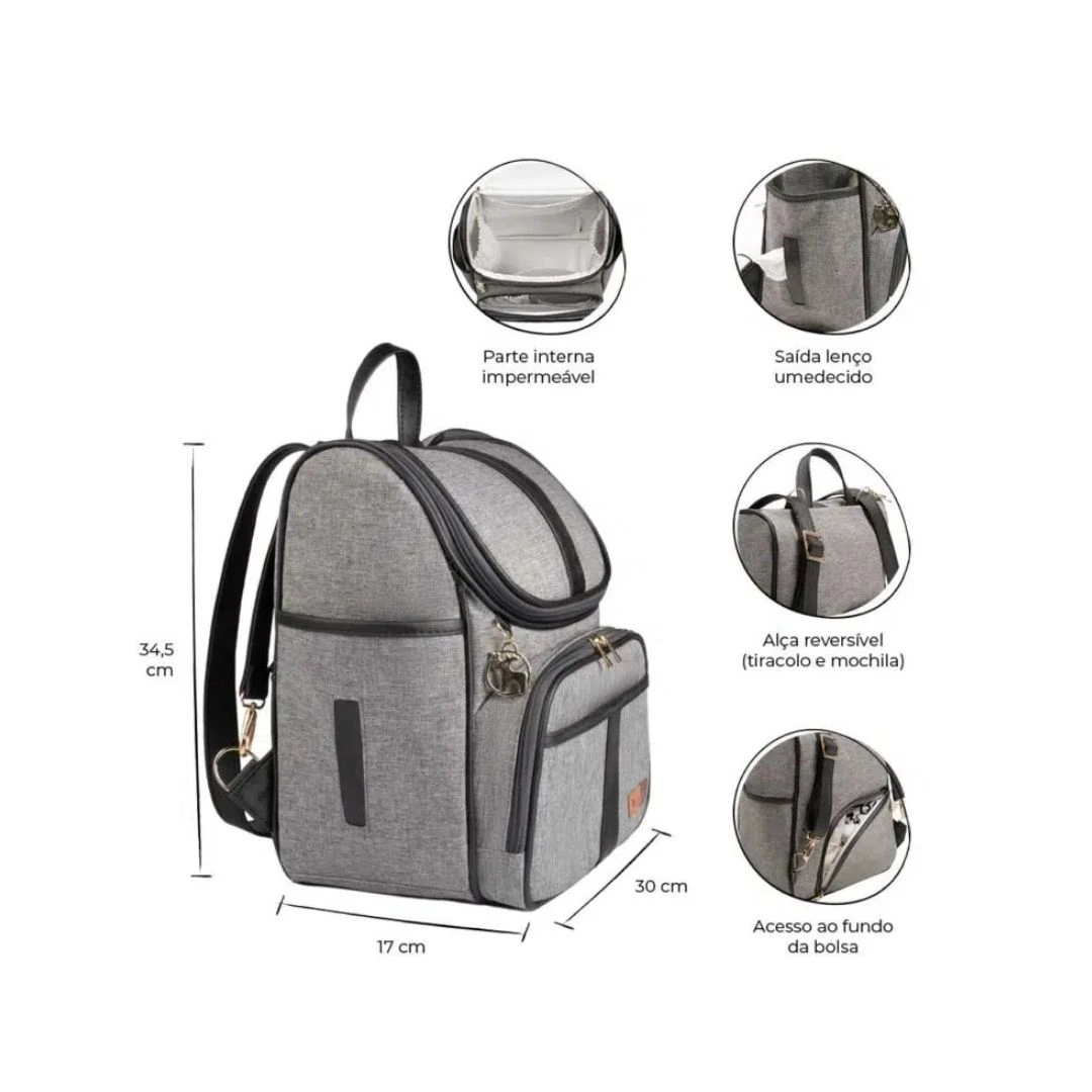 Como Bolsa você possui acesso mais fácil aos itens da bolsa Já como Mochila, ela oferece melhor distribuição do peso e deixa as mãos livres permitindo maior liberdade de movimentos Tudo que os pais precisam ao sair de casa com o bebê é de praticidade, a bolsa precisa “vestir bem” por isso a alça é regulável e multifuncional, use como preferir O design é exclusivo, com detalhes diferenciados pensados em oferecer praticidade e estilo nos passeios com o bebê. Um dos bolsos laterais tem a função porta lenço umedecido, e outro bolso é amplo para levar a mamadeira, copinho ou outros itens essenciais. Na parte traseira da bolsa temos também um zíper que facilita o acesso aos itens que ficam no fundo da bolsa. A Lebaby 2 em 1 é sem dúvidas uma bolsa perfeita e essencial para o enxoval do bebê.
