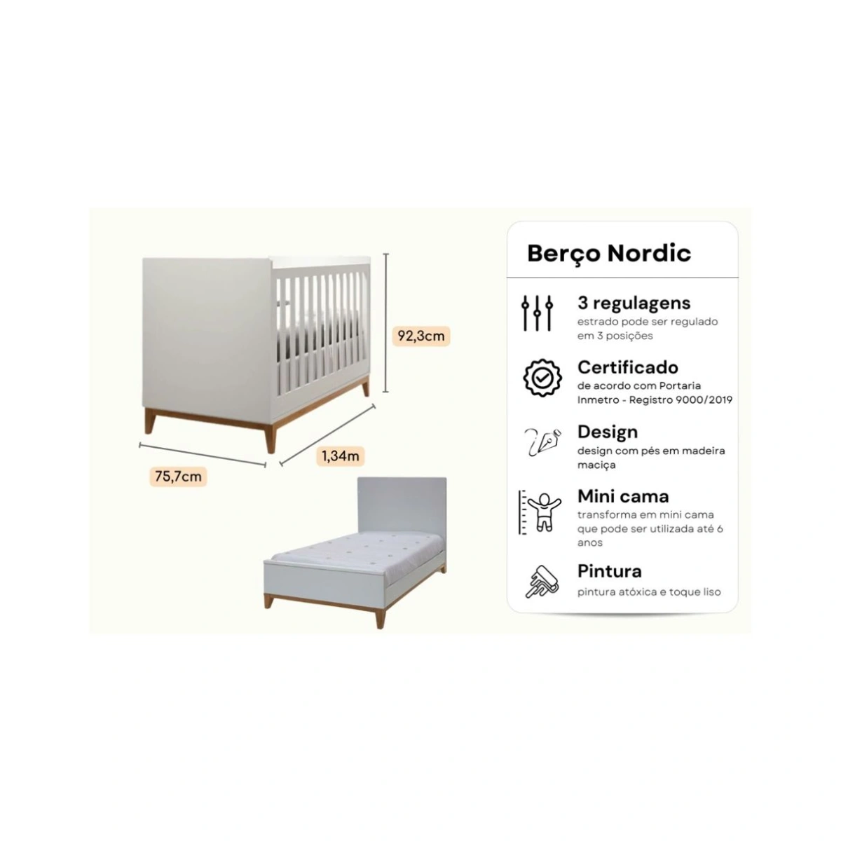 Berço padrão americano, com grade fixa, certificado pelo INMETRO Funcional: com 3 regulagens de estrado 2em1: Peças inclusas para transformar em mini cama (mini grade não inclusa) Durável: Mini cama que pode ser utilizada até os 6 anos de idade Pintura: Atóxica, com acabamento acetinado, toque liso Design: estilo nórdico, escandinavo, minimalista, com pés de madeira na tonalidade Mel da Puppi Mobile que pode ser combinado com outras coleções! Certificado: de acordo com a Portaria Inmetro, Registro 9000/2019 Colchao Incluso