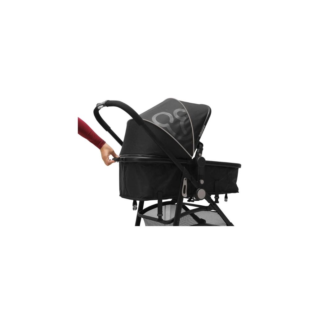Carro berço-passeio destinado para crianças a partir de 0 meses com peso até 15Kg Estrutura em alumínio Fechamento com uma mão Assento Reversível, também se transforma em berço moisés Encosto regulável em 3 posições Cinto de segurança de 5 pontos 2 rodas dianteiras com travamento do sistema giratório 2 rodas traseiras com sistema de freio único Acopla bebê conforto direto na estrutura