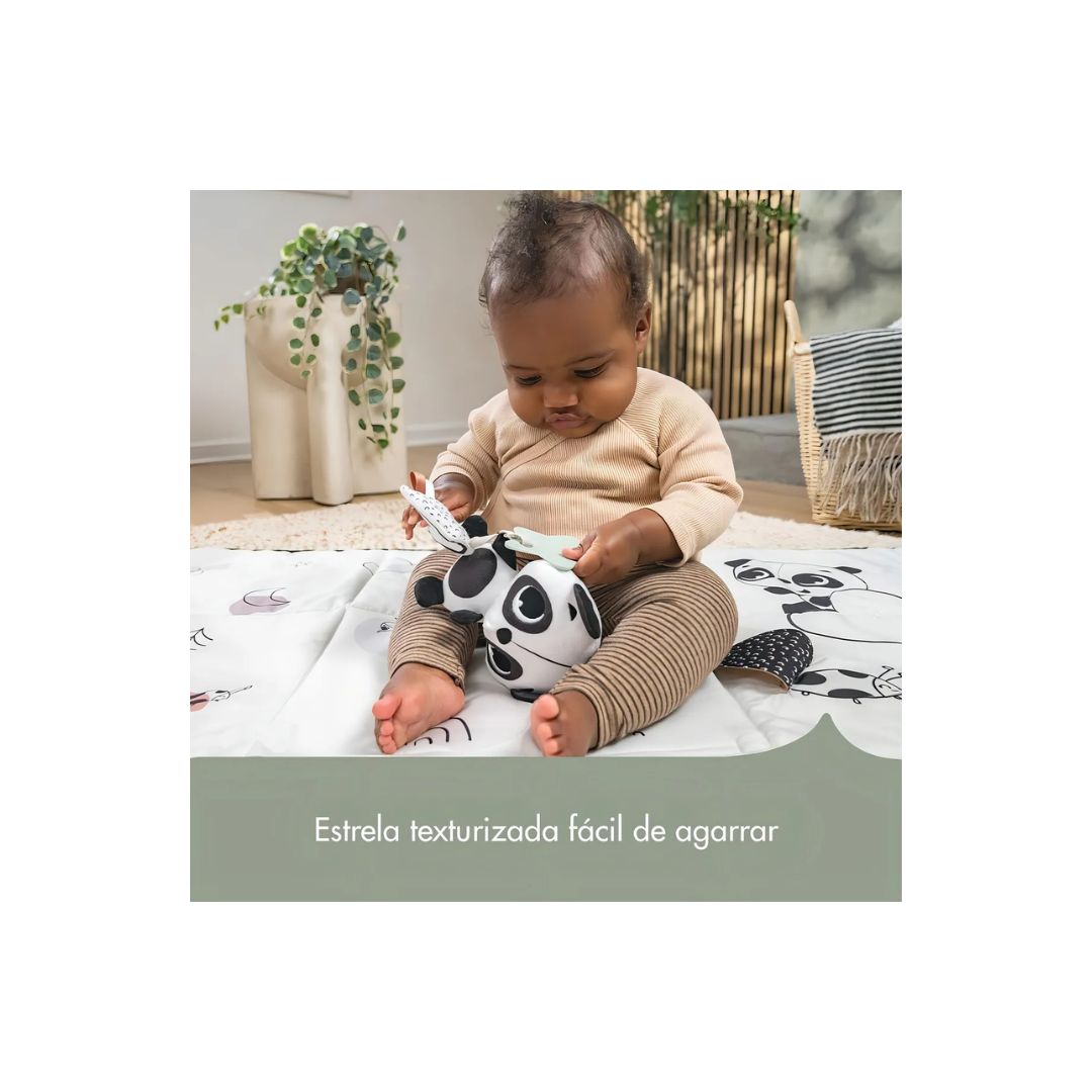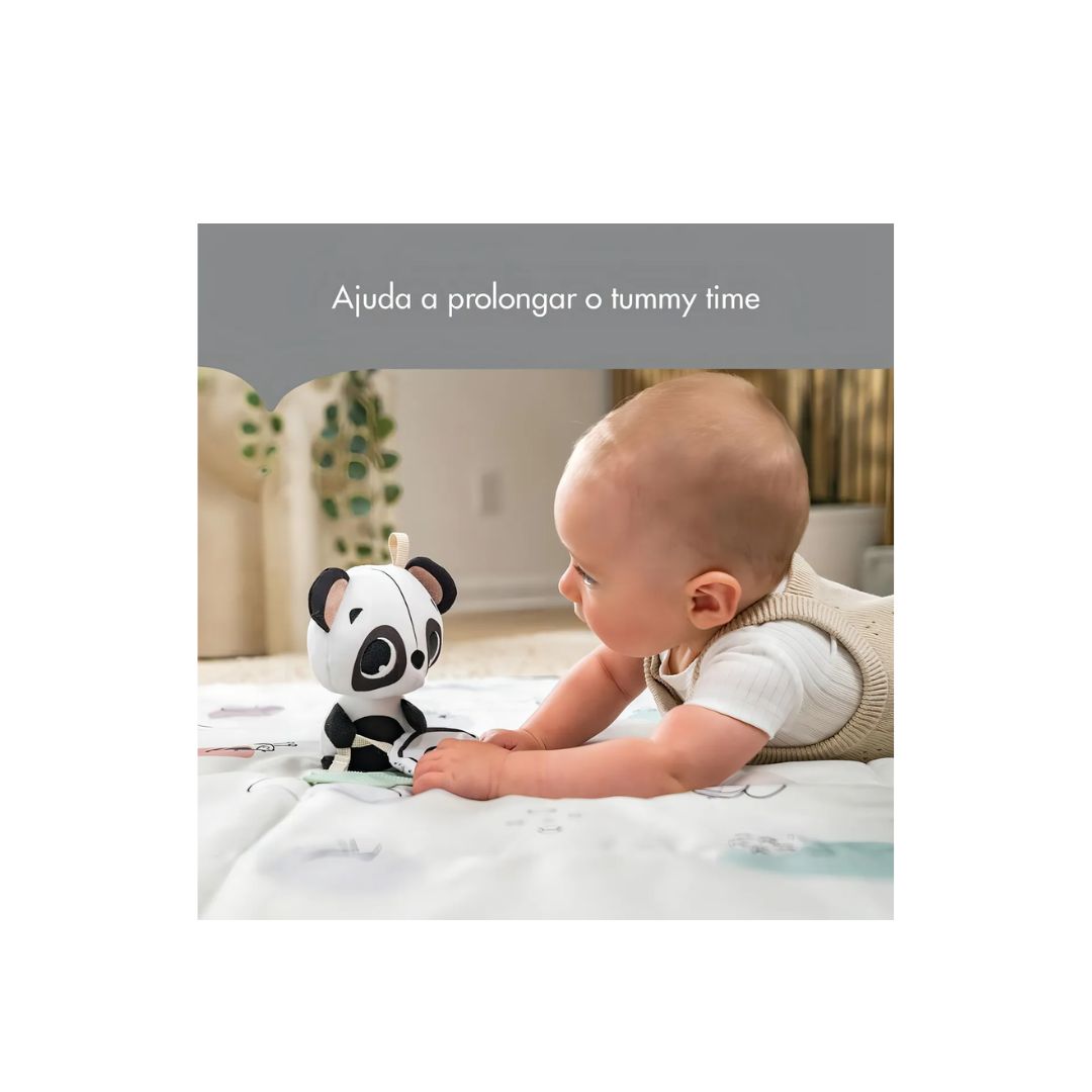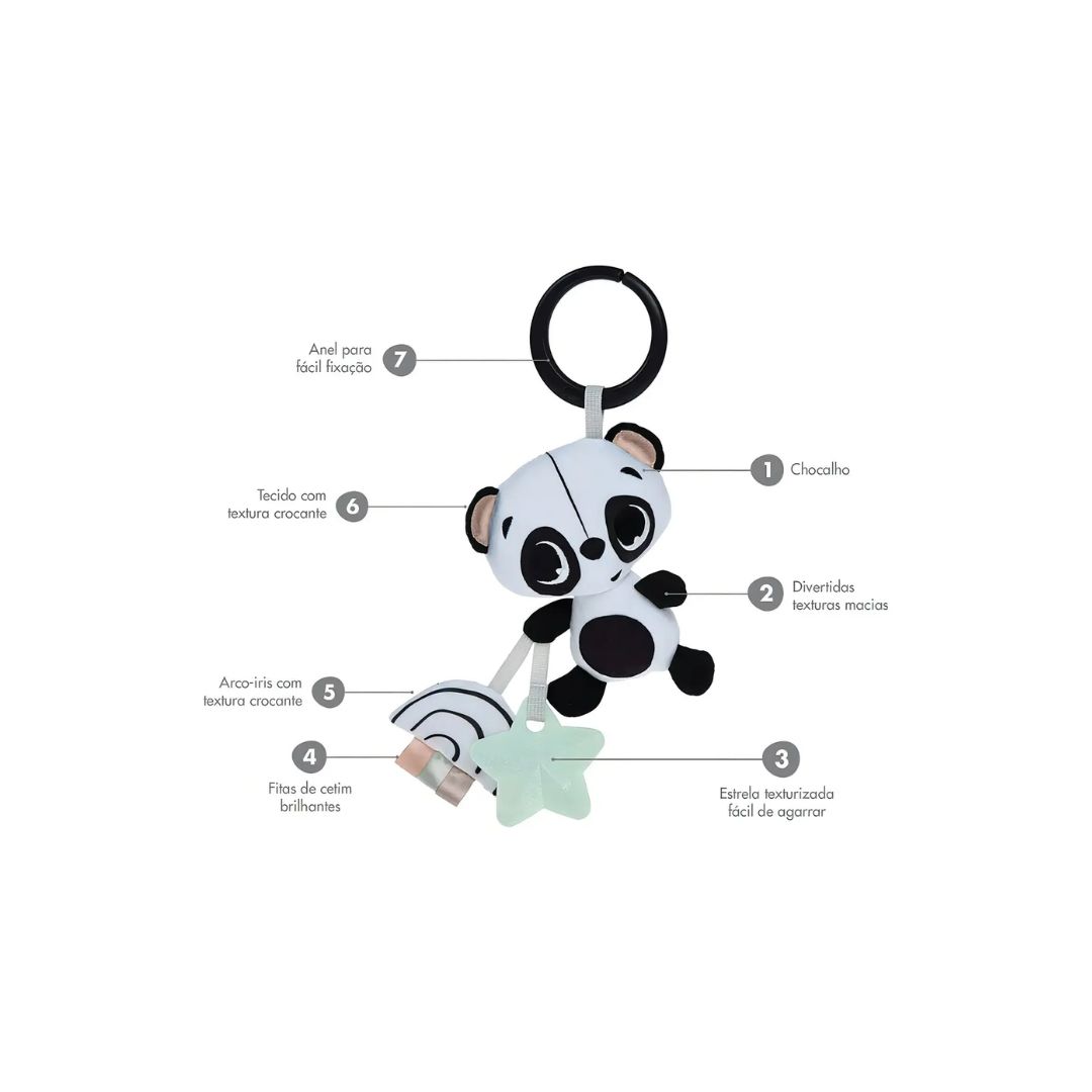 Pelúcia com riqueza tátil, visual e auditiva Em preto e branco, estimula a visão do bebê desde o nascimento Um brinquedo adorável para conforto e familiaridade O mordedor e as fitas ajudam a fortalecer os dedinhos Texturizado e fácil de segurar, auxilia no alívio da dentição O chocalho de pelúcia e o arco-íris crocante fornecem estímulo auditivo Possui clipe universal para prender em carrinhos, berços, moisés e bebês conforto