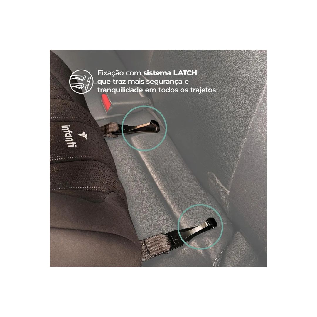 Indicado para crianças de 15 a 36 kg Estrutura ergonômica: Respeita a postura da criança, ideal para viagens longas Fixação LATCH: Sistema de instalação direta no banco dos carros com entrada Isofix Cinto de Segurança: Utilização do próprio cinto do veículo para prender a criança Capa removível e lavável: Facilita a limpeza e manutenção do assento Porta-copos integrado: Fixo e lateral, mantém a bebida sempre ao alcance da criança