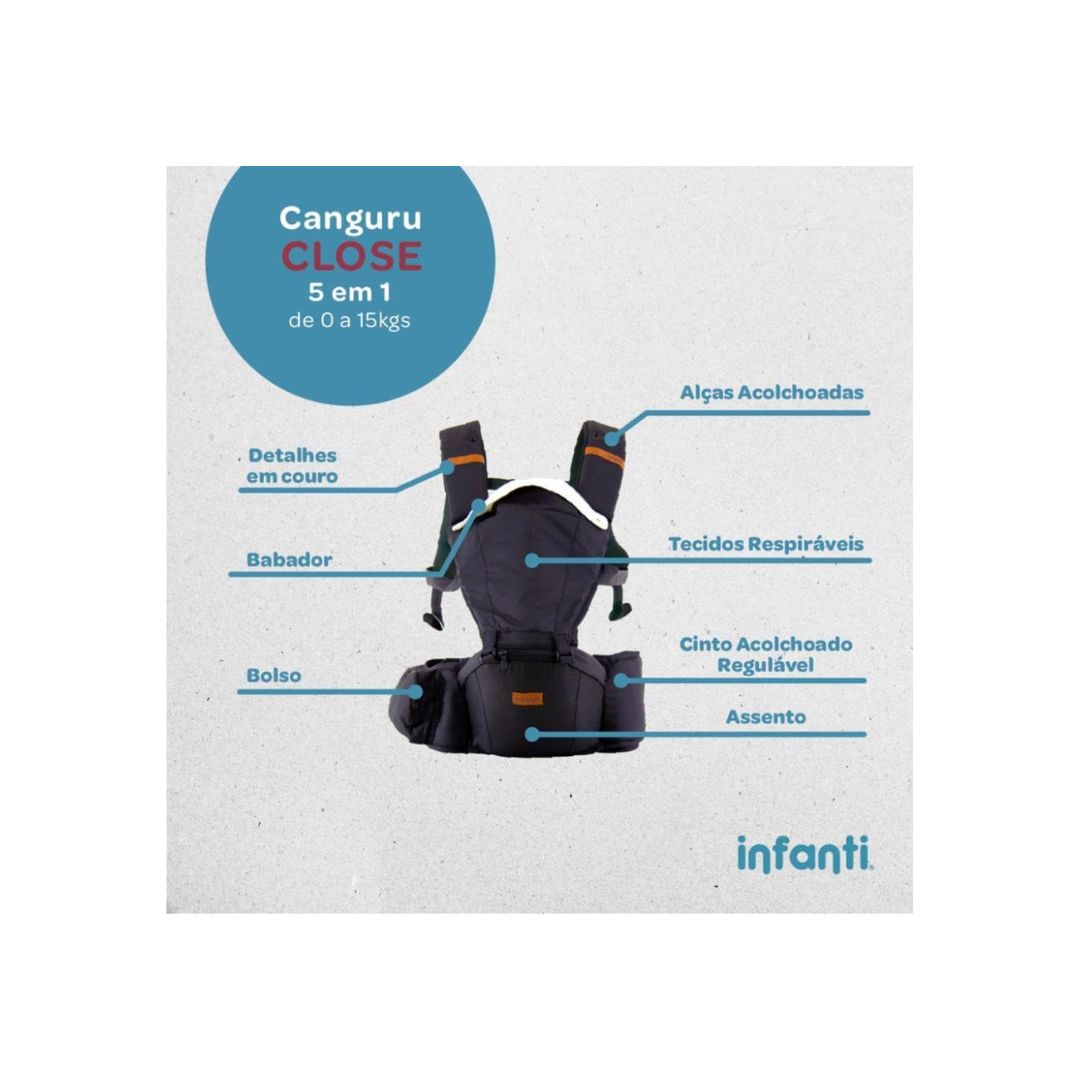 Detalhes em couro Acompanha babador Bolso com zíper para pequenos objetos Suporte do encosto em tecido respirável Faixa abdominal ajustável com velcro e fivela Indicado para utilizar desde o nascimento até 15kg Alças acolchoadas, macias, reguláveis e com tecido respirável Montagem fácil e segura do suporte do encosto com zíper e velcro 5 modos de uso: Um modo de uso para cada fase do bebê e necessidade dos pais, prático e seguro. Tamanho ajustável até XL: Regulável para uso por pessoas de tamanhos diferentes, mais conforto para mamães e papais Apoio para carregar o recém-nascido: Uso desde os primeiros dias como apoio para os braços da mamãe e do papai para longas horas de cuidado Banquinho para os maiores: Reduz a sensação de peso e melhora a postura ao carregar as crianças maiores Bebê virado para os pais ou para o mundo: Com o encosto superior encaixado, permite duas posições de uso de acordo com o momento do bebê Carregar o bebê nas costas: Para transportar as crianças maiores, que já se sentam, com mais conforto para elas e para quem carrega