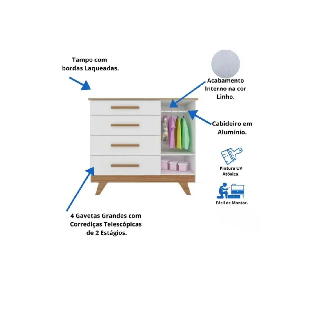 Cômoda Retrô 100% MDF Tampo com borda laqueadas Cabideiro metálico Puxadores em MDF revestido Corrediças telescópicas Pintura atóxica 118x50x1,04